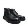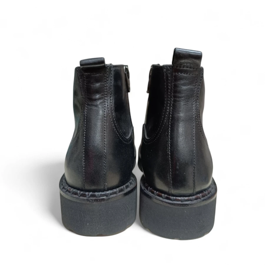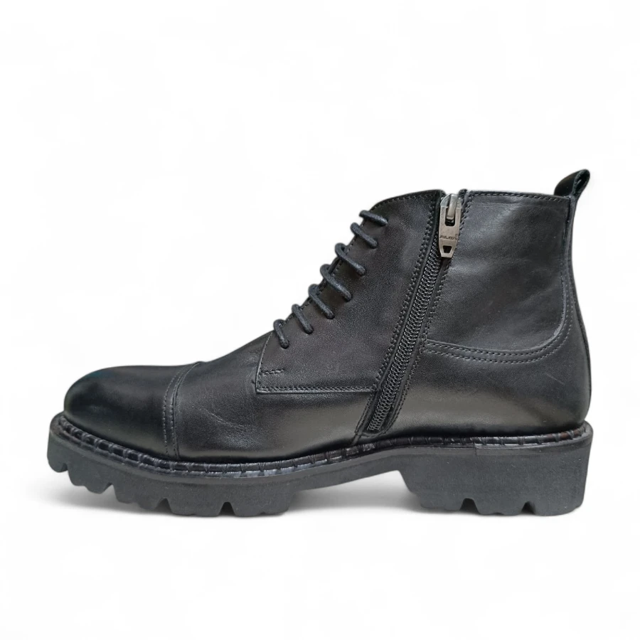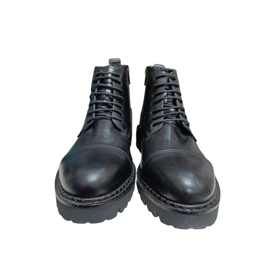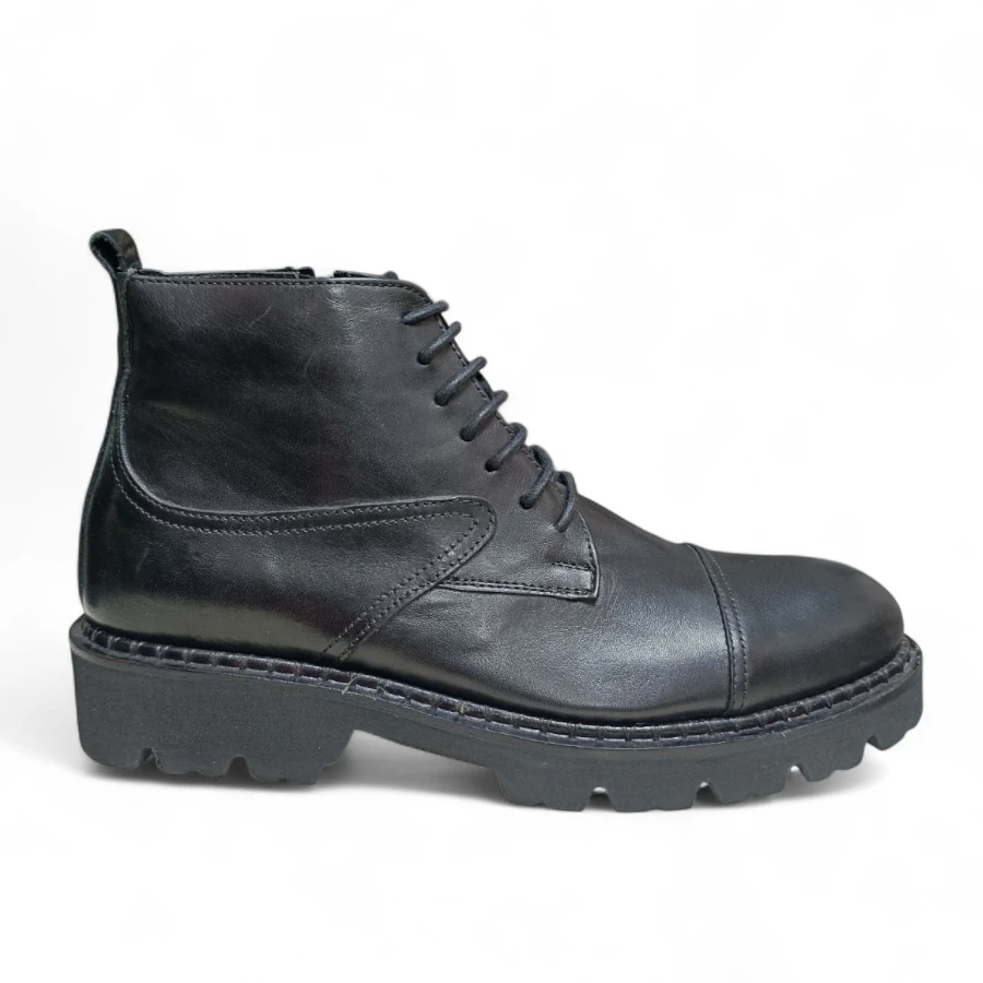 Кожни елегантни црни чизми изработени од 100% природна кожа. Внатрешноста е обложена со текстил кој нуди удобност и топлина за студените зимски денови. Овој модел има врвки и функционалeн патент од внатрешната странa.