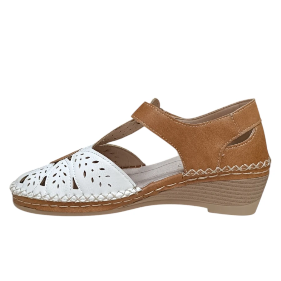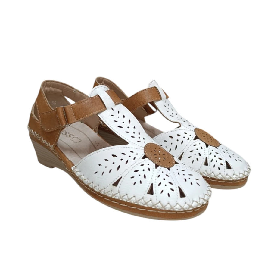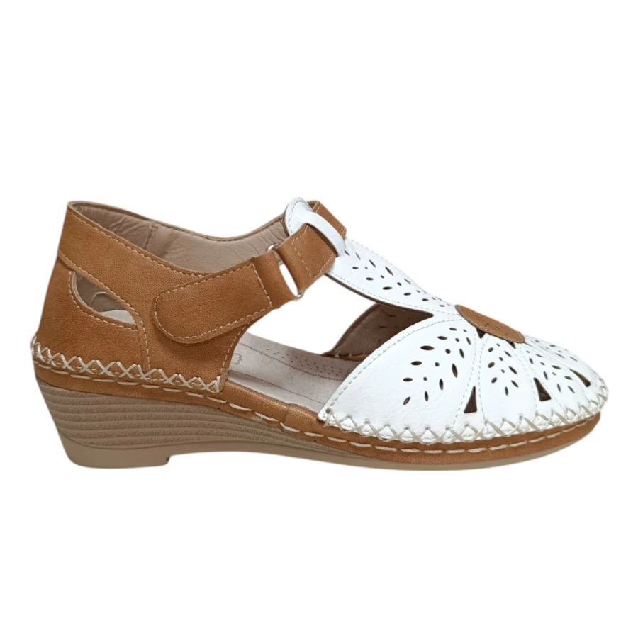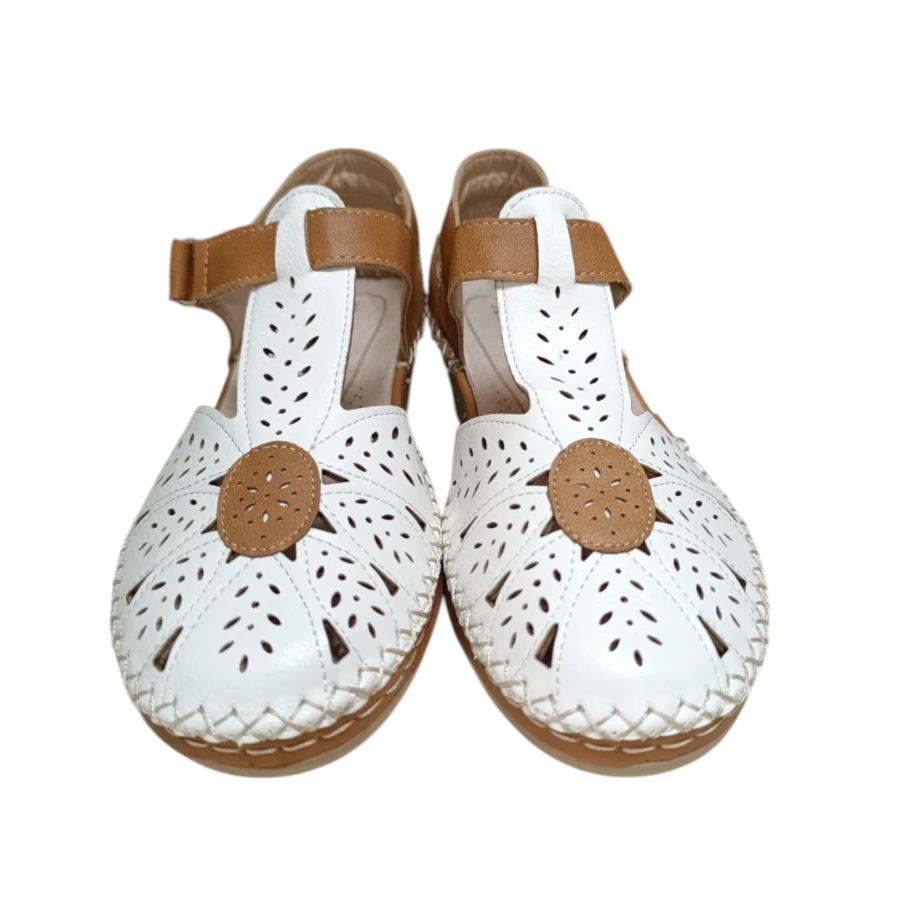 • Бели-камел кондур сандали со дупчиња, погодни како за секојдневно носење, така и за специјални поводи.